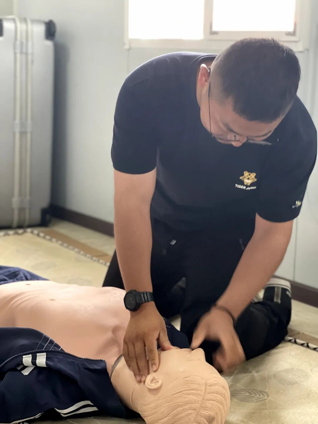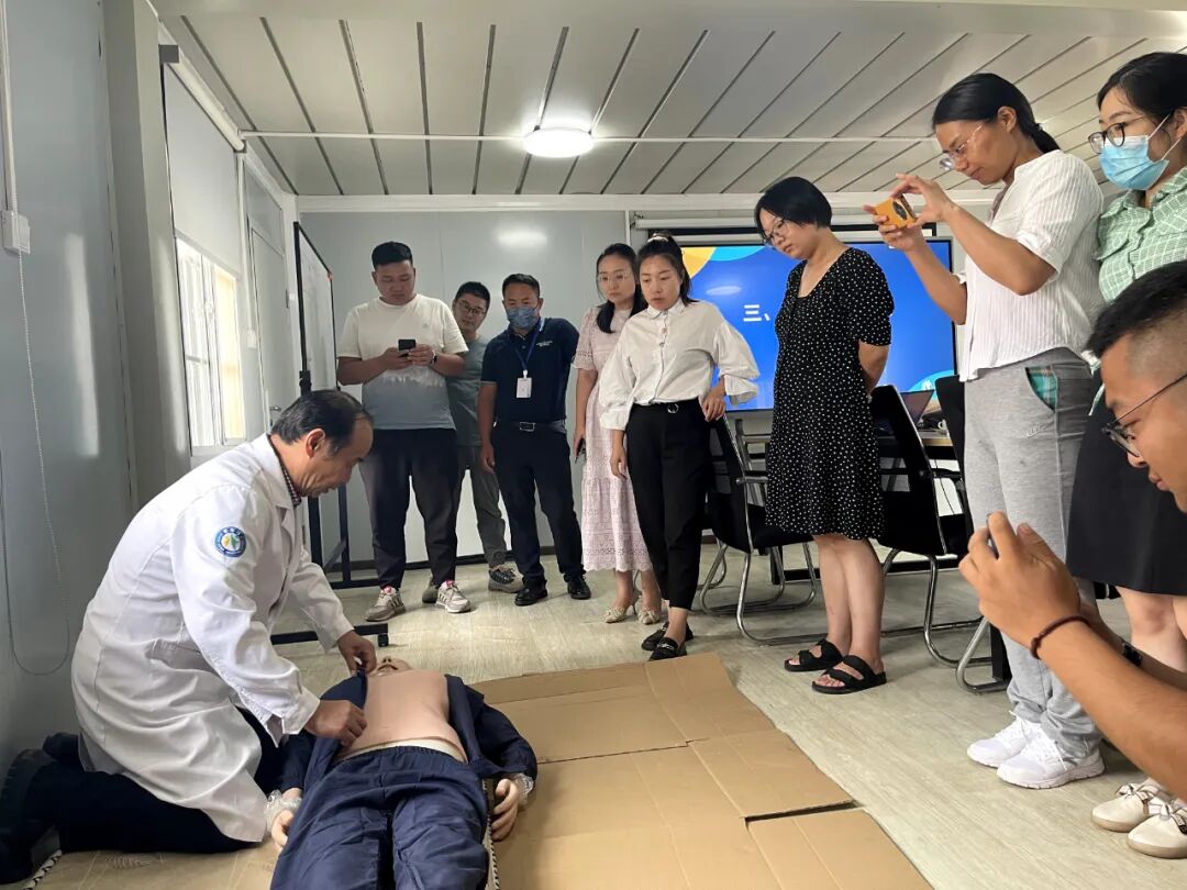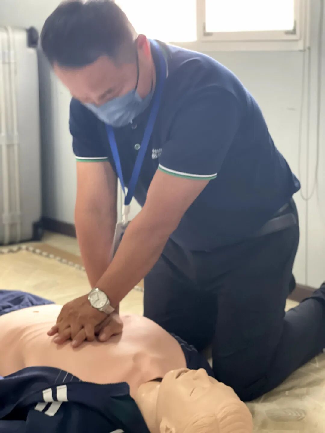 在实践演练环节,借助教学假人模型,李主任指导参训人员按照正确步骤和操作要领,进行了心肺复苏和AED(自动体外除颤仪)操作及演练,针对胸外按压、开放气道、人工呼吸,配合AED使用等步骤进行了反复训练。通过现场操作,参训人员逐项过关,熟练掌握了心肺复苏的操作步骤,进一步提升了处理突发紧急情况的能力。