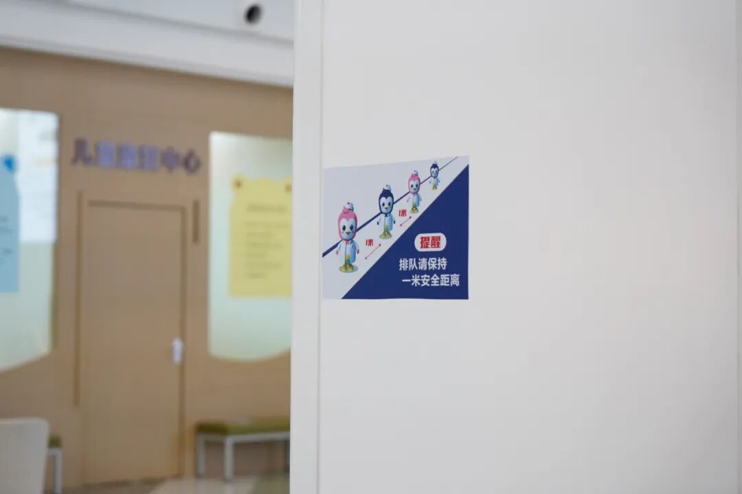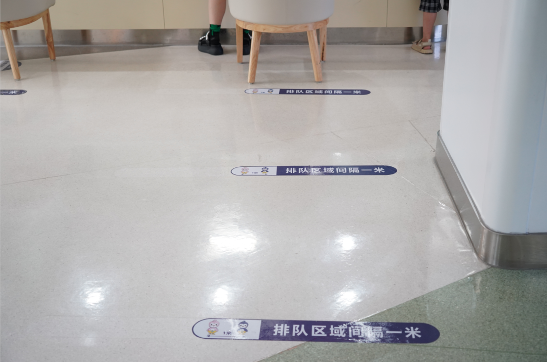 在各楼层门诊处、缴费处等窗口,都贴有“疫情期间,请保持1米就坐”、“排队区域间隔一米”等提醒,工作人员也会从旁引导。